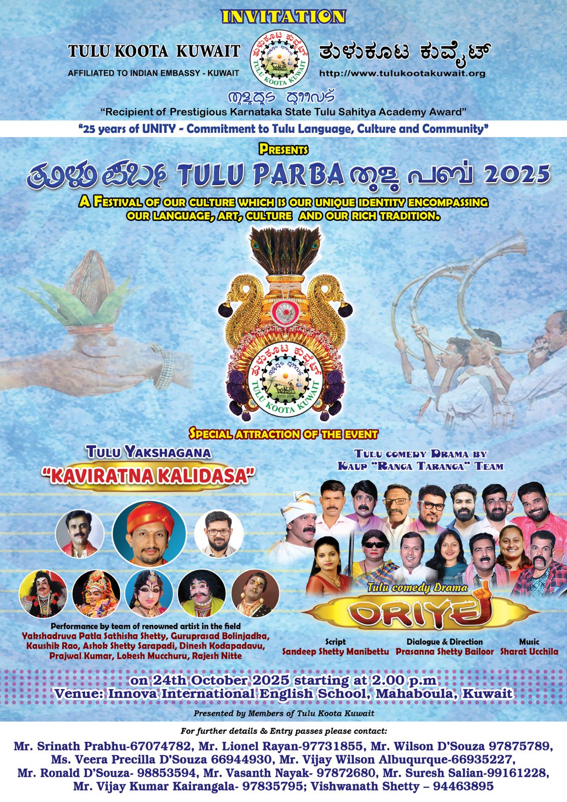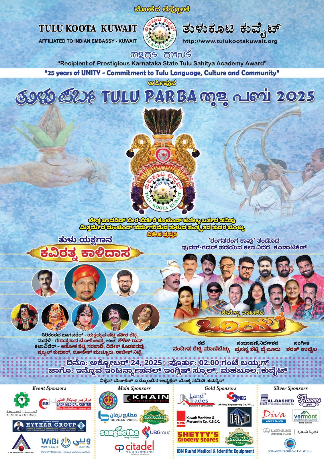 Tulu Koota Kuwait (TKK) is celebrating Tulu Parba 2025, a festival of language & culture on Friday, 24th October 2025, at Innova International English School Auditorium, Mahaboula.